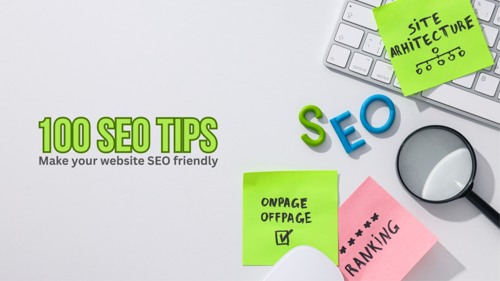 A comprehensive list of 100 unique SEO tips you can share on your social media page. These tips are divided into actionable categories to make them more engaging.